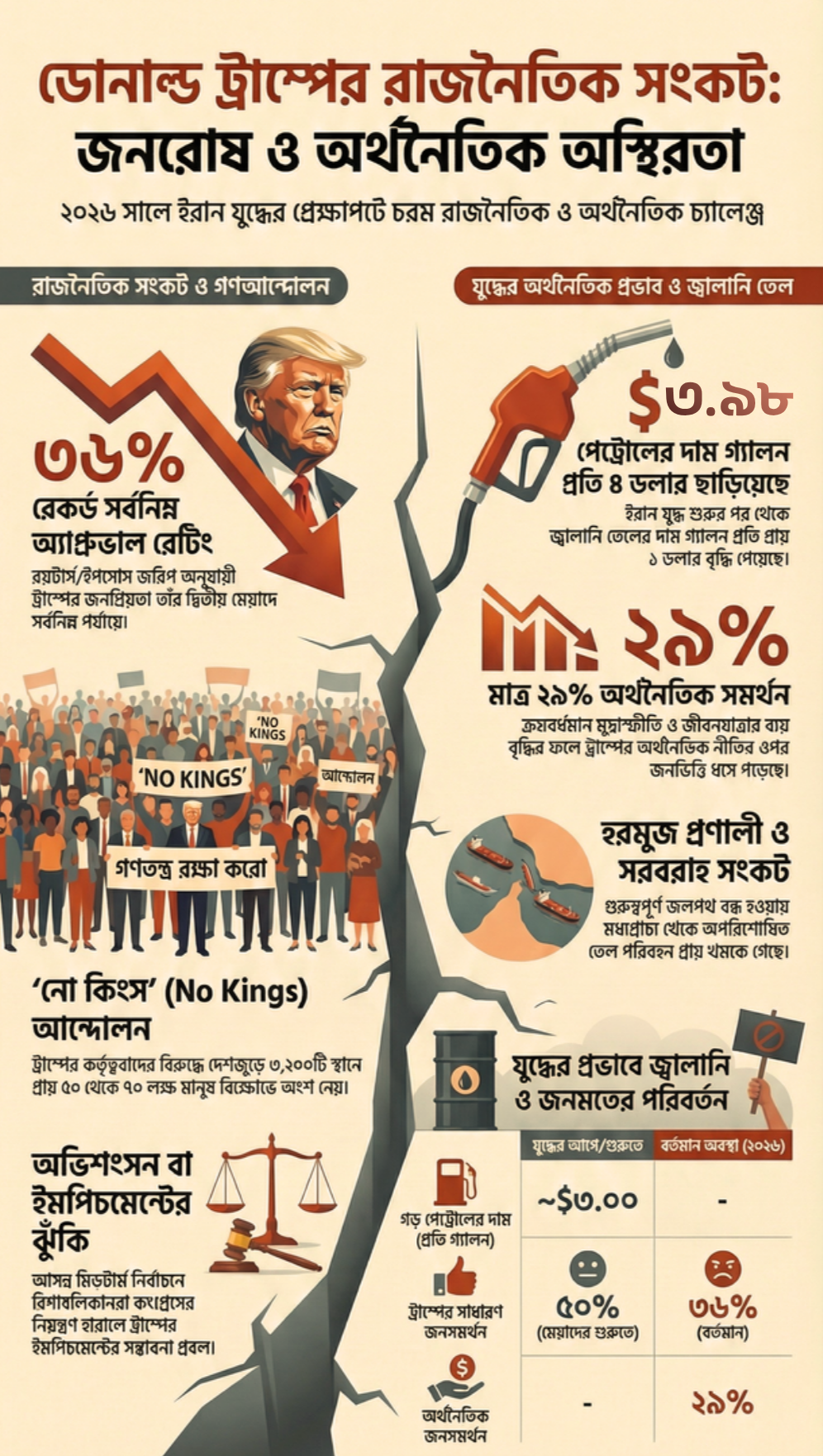 ডোনাল্ড ট্রাম্প হোয়াইট হাউসে ফিরে আসার পর থেকে বর্তমানে তার জনপ্রিয়তার হার সর্বনিম্ন পর্যায়ে। এর অন্যতম কারণ হলো দেশের অভ্যন্তরে গড়ে ওঠা ‘নো কিংস’ আন্দোলন এবং যুদ্ধের প্রতি জনসমর্থনের অভাব।