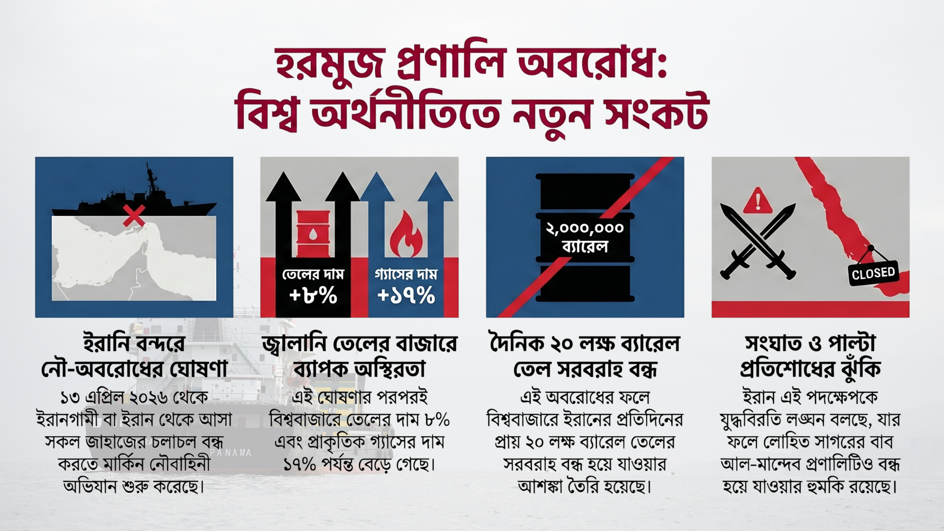 এই অবরোধ পুরোপুরি কার্যকর হলে বিশ্ববাজারে প্রতিদিন প্রায় দুই মিলিয়ন ব্যারেল ইরানি তেলের সরবরাহ বন্ধ হয়ে যাবে, যা আগে থেকেই চাপে থাকা বৈশ্বিক জ্বালানি সরবরাহ ব্যবস্থাকে আরও গভীর সংকটের দিকে ঠেলে দেবে।