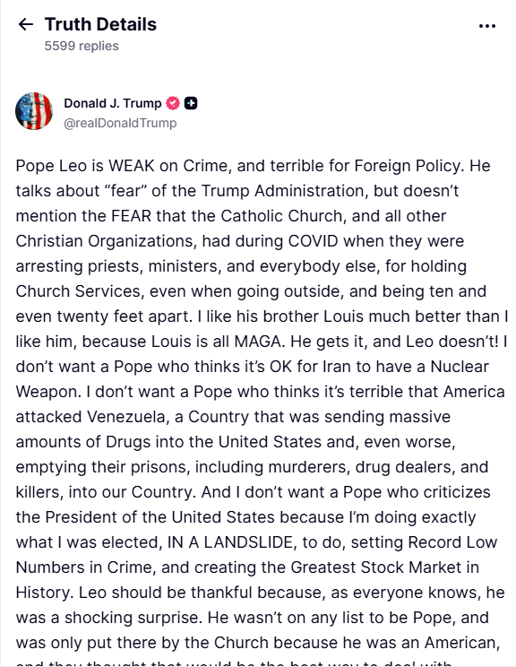 পোপের শান্তিবাদী অবস্থানের প্রতিক্রিয়ায় ডোনাল্ড ট্রাম্প তার নিজস্ব সামাজিক যোগাযোগমাধ্যম ‘ট্রুথ সোশ্যালে’ পোপের বিরুদ্ধে একটি তীব্র আক্রমণাত্মক পোস্ট দেন।