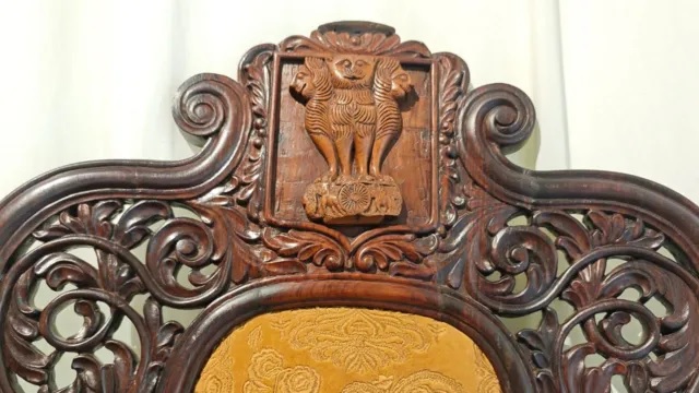 এটি ১৯ শতকের গুজরাটের এক ভারতীয় রাজার দরবার হলের চেয়ার। চেয়ারের পেছনে একটি ফলকে নির্মাণকারী কারিগরের নাম এবং নির্মাণের মাস ও বছর খোদাই করা আছে।