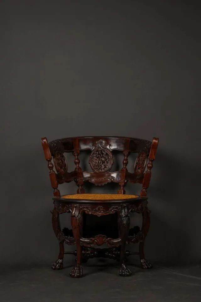 বারগান্ডি ও সোনালি রঙে তৈরি এই বিশাল সেগুন কাঠের চেয়ার ক্ষমতা ও কর্তৃত্বের প্রতীক। সাধারণত রাজা বা ধর্মীয় নেতারা এমন চেয়ার ব্যবহার করতেন। বিবেক গান্ধীর মতে, ১৯ শতকের ভারতে কোনো ব্রিটিশ কর্মকর্তা এটি ব্যবহার করে থাকতে পারেন।