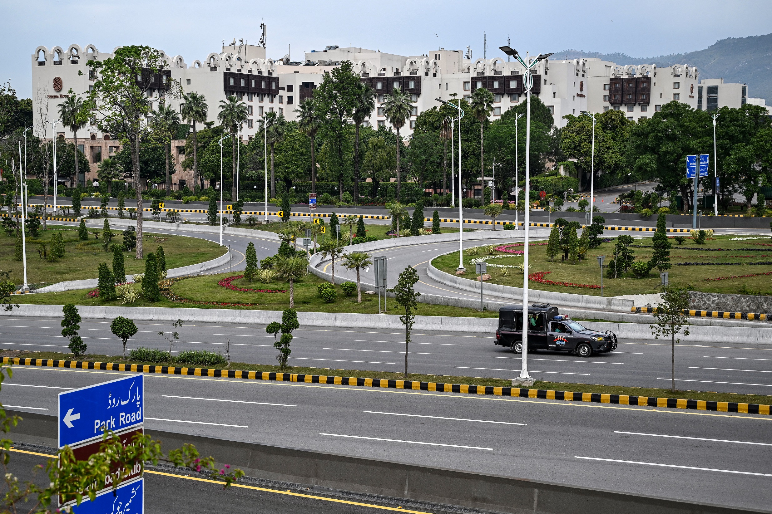 ইসলামাবাদের ‘রেড জোন’ এলাকায় অবস্থিত সেরেনা হোটেলের কাছে টহল দিচ্ছে পুলিশ, যেখানে যুক্তরাষ্ট্র-ইরান শান্তি আলোচনার সম্ভাব্য ভেন্যু হিসেবে প্রস্তুতি নেওয়া হয়েছে। ছবি: এএফপি