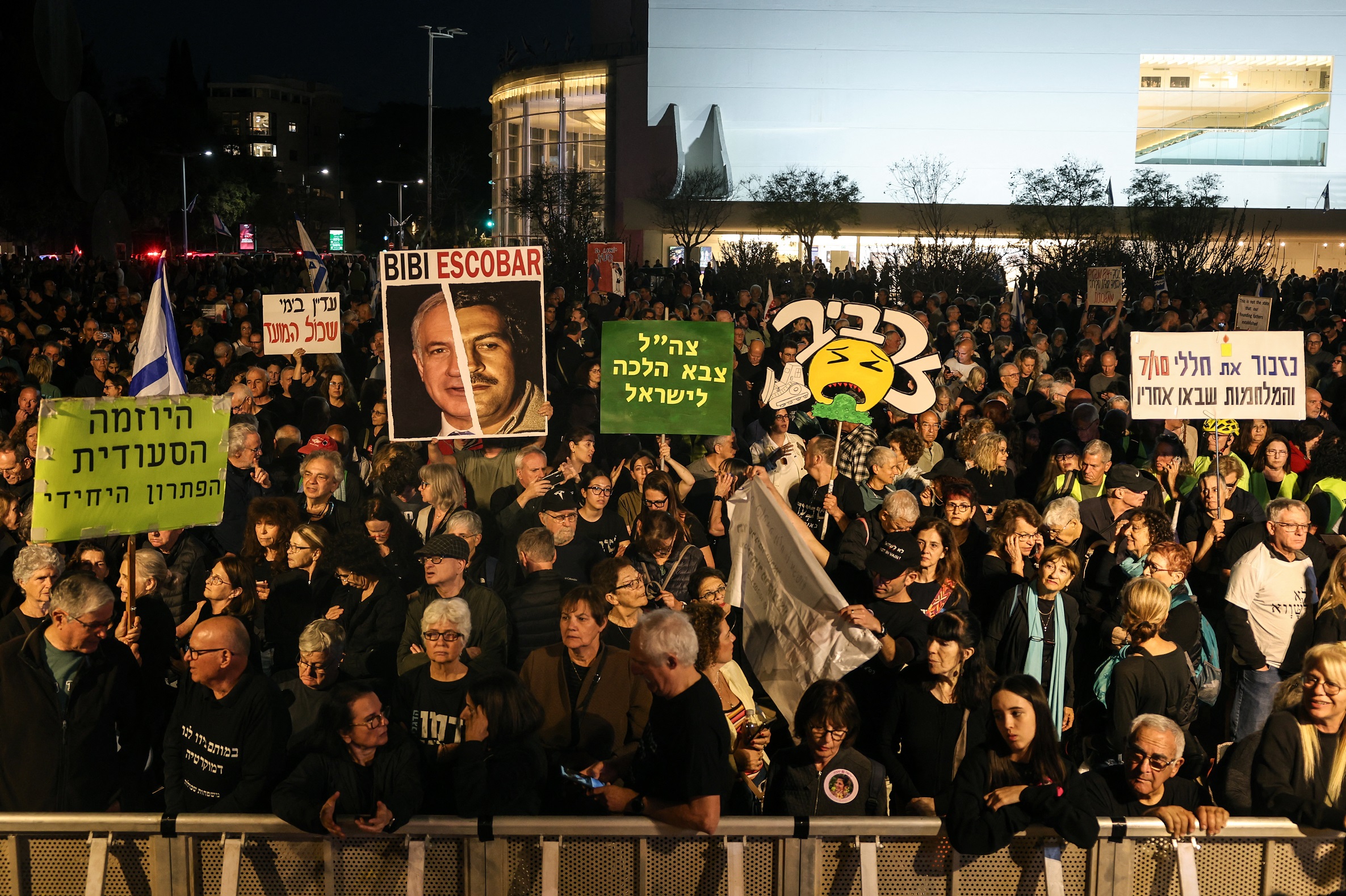 ইসরায়েলের তেল আবিবে শনিবার রাতে প্রধানমন্ত্রী বেনিয়ামিন নেতানিয়াহু ও তার সরকারের বিরুদ্ধে বিক্ষোভ করেছেন হাজারো মানুষ। এসময় চলমান যুদ্ধ, নিরাপত্তা ব্যর্থতা এবং রাজনৈতিক সিদ্ধান্ত নিয়ে ক্ষোভ প্রকাশ করেন তারা।