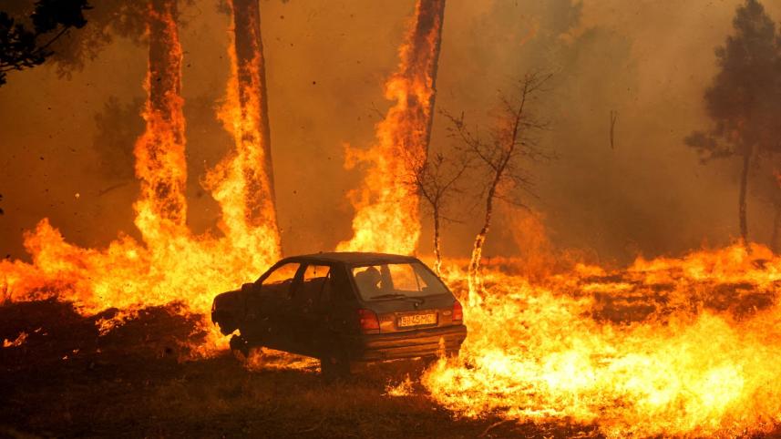 ১৫ আগস্ট, পর্তুগালের মেডায় দাবানলে একটি গাড়ি জ্বলতে দেখা যাচ্ছে। ছবি: রয়টার্স/পেদ্রো নুনেস