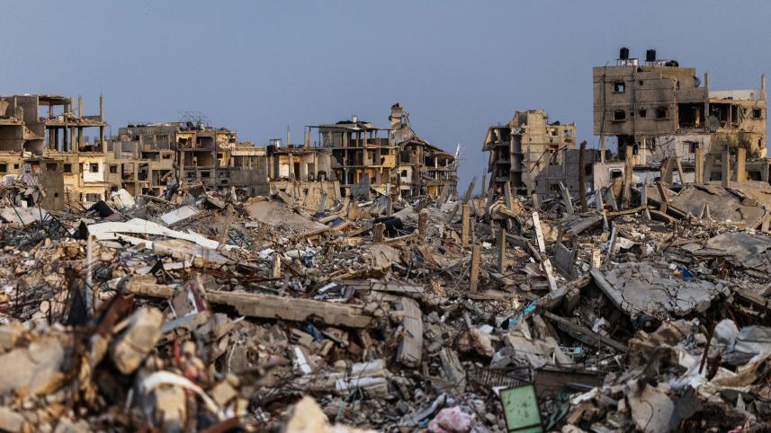 ৮ ডিসেম্বর, দক্ষিণ গাজা উপত্যকার রাফায় ধ্বংসস্তূপের মধ্যে পড়ে থাকা বিধ্বস্ত ভবন। ছবি: রয়টার্স/নির এলিয়াস