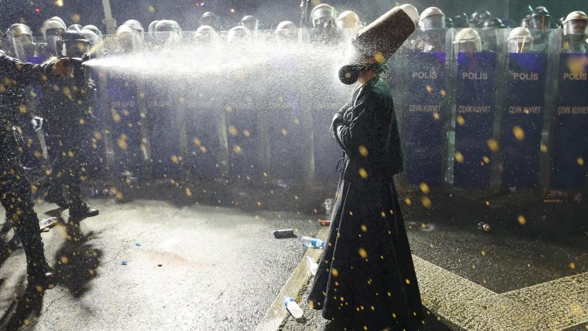 ২৩ মার্চ, তুরস্কের ইস্তাম্বুলে দুর্নীতি তদন্তের অংশ হিসেবে মেয়র একরেম ইমামোগলুকে কারাগারে পাঠানোর দিনে এক বিক্ষোভকারীর ওপর পেপার স্প্রে ব্যবহার করছে পুলিশ। ছবি: রয়টার্স/উমিত বেকতাস