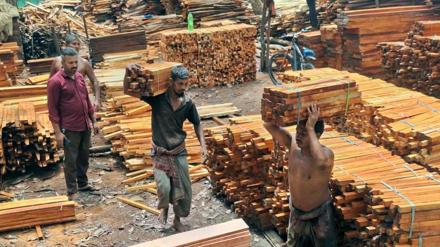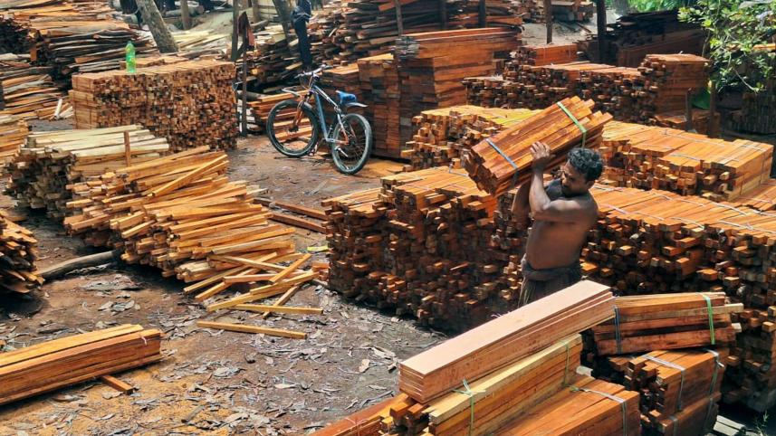 পিরোজপুরের নেছারাবাদ উপজেলার মাহমুদকাঠি গ্রামে করাতকলে চলছে কাঠ চেরাই। স্থানীয় ব্যবসায়ীরা বিভিন্ন আকারের মেহগনি কাঠ কিনে রাজধানী ঢাকায় ফার্নিচার তৈরির কারখানায় সরবরাহ করেন। ছবি তুলেছেন দ্য ডেইলি স্টারের আলোকচিত্রী টিটু দাস।